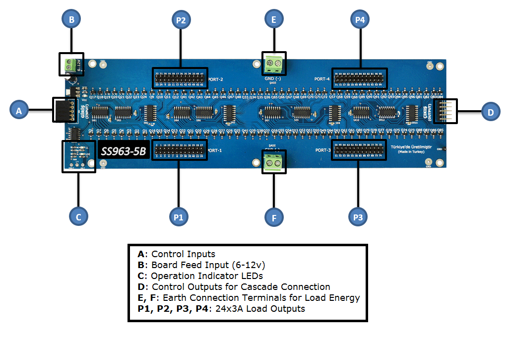 The SS963-5B has 3 indicator LEDs. From these LEDs, Vcc LED indicates that the board's supply voltage is supplied and the board is energized. The LL labeled LED lights up when each 96-bit data sent to the board. The LOE LED displays at low logic and goes off when the outputs are active.